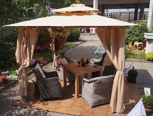 Мы хотим предложить вам тент-шатёр GHGMKG008, выполненный в восточном стиле, у такого шатра крыша выполнена в восточном стиле. Сам шатёр выполнен в бежевом цвете, его вес составляет 34 кг. Размер крыши составляет 300 х 300 х 260 см. Для изготовления крыши использовался водонепроницаемый полиэстер плотностью 180 г.