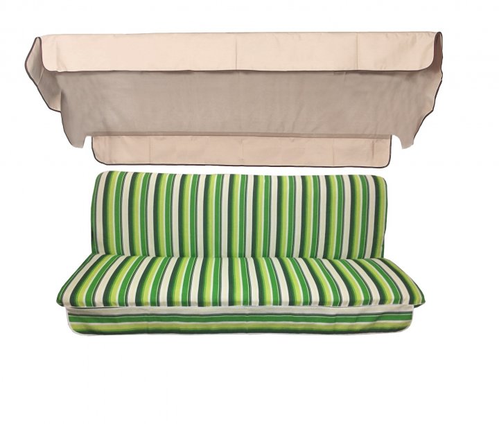 Данный комплект предназначен для садовых качелей. В комплекте находится тент, а также сам матрас. Предназначен он для длины сидения 180 см, а тент имеет размер 120 на 210 см. Верхняя часть изготовлена из ткани оксфорд, а нижняя из полиэстера. На изделии есть специальные молнии для того, чтобы чехол можно было с лёгкостью снять и постирать, кроме того, на нём есть завязки для удобного крепления к садовым качелям.